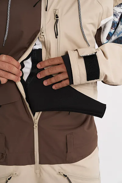 - Съемная деталь под крюк кайтовой трапеции. К комбинезону крепится съемная деталь под крюк трапеции из водонепроницаемой ткани. Она надежно защищает от попадания внутрь комбинезона снега и влаги, а главное - ветра, который является необходимым условием для занятия сноукайтингом.
